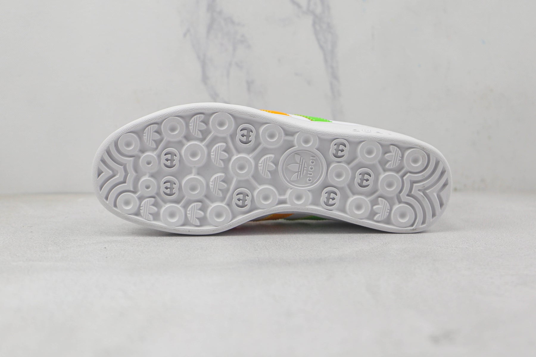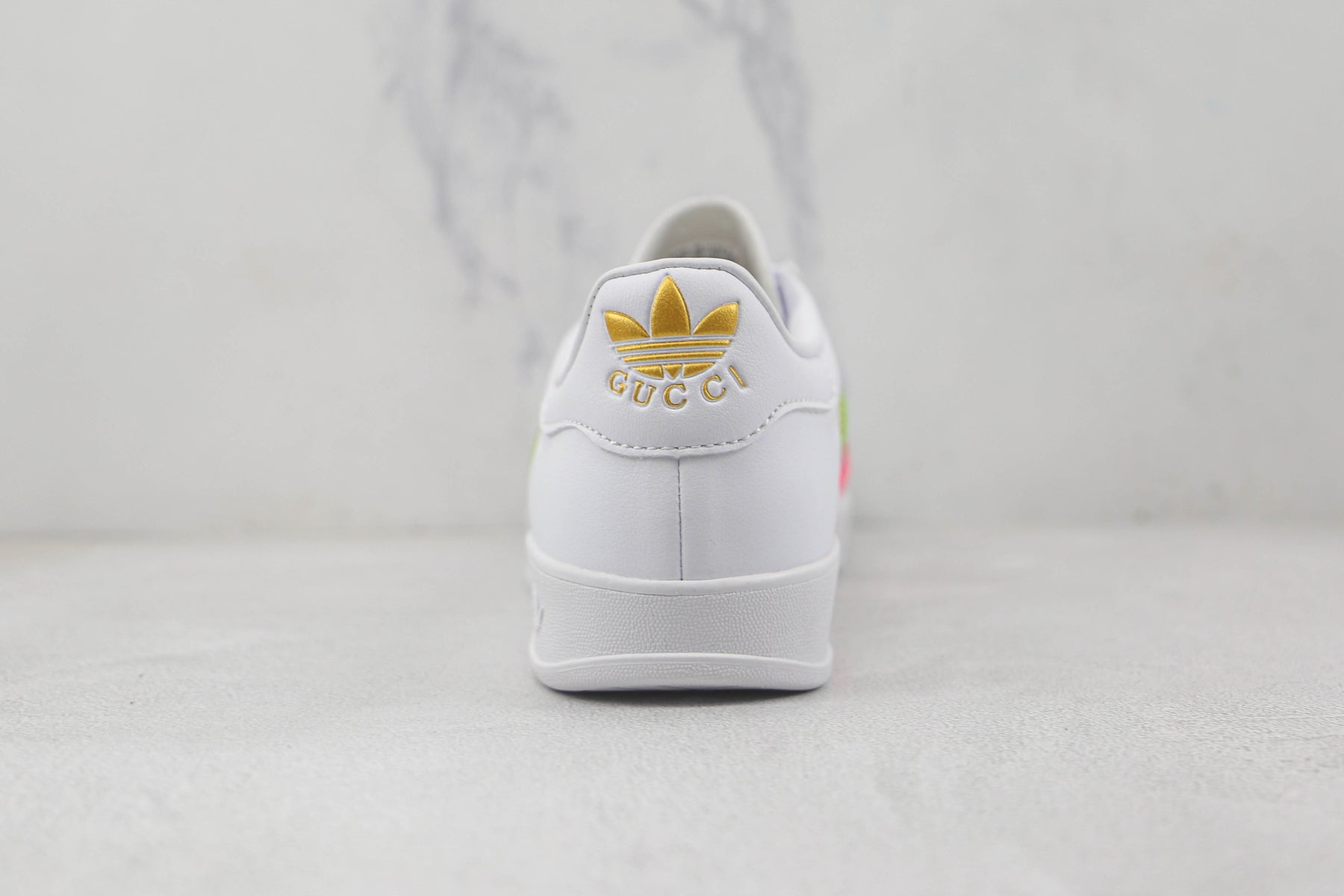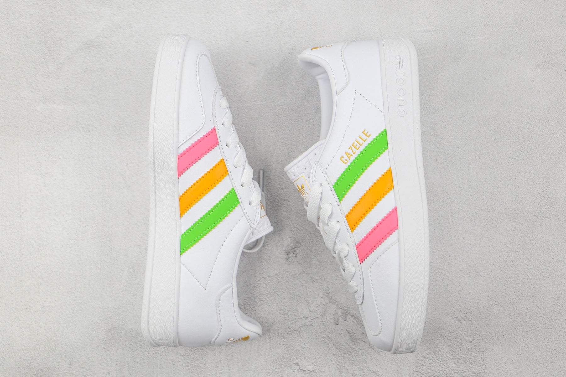 The GC Gazelle Sneaker – White/Multicolor reimagines the iconic Gazelle silhouette with a vibrant and playful twist. Set on a crisp white base, the sneaker is highlighted by three bold stripes in pink, orange, and neon green, paired with golden "GAZELLE" branding for a touch of elegance. Finished with premium detailing and crafted for comfort, this model captures the perfect balance between streetwear energy and luxury fashion