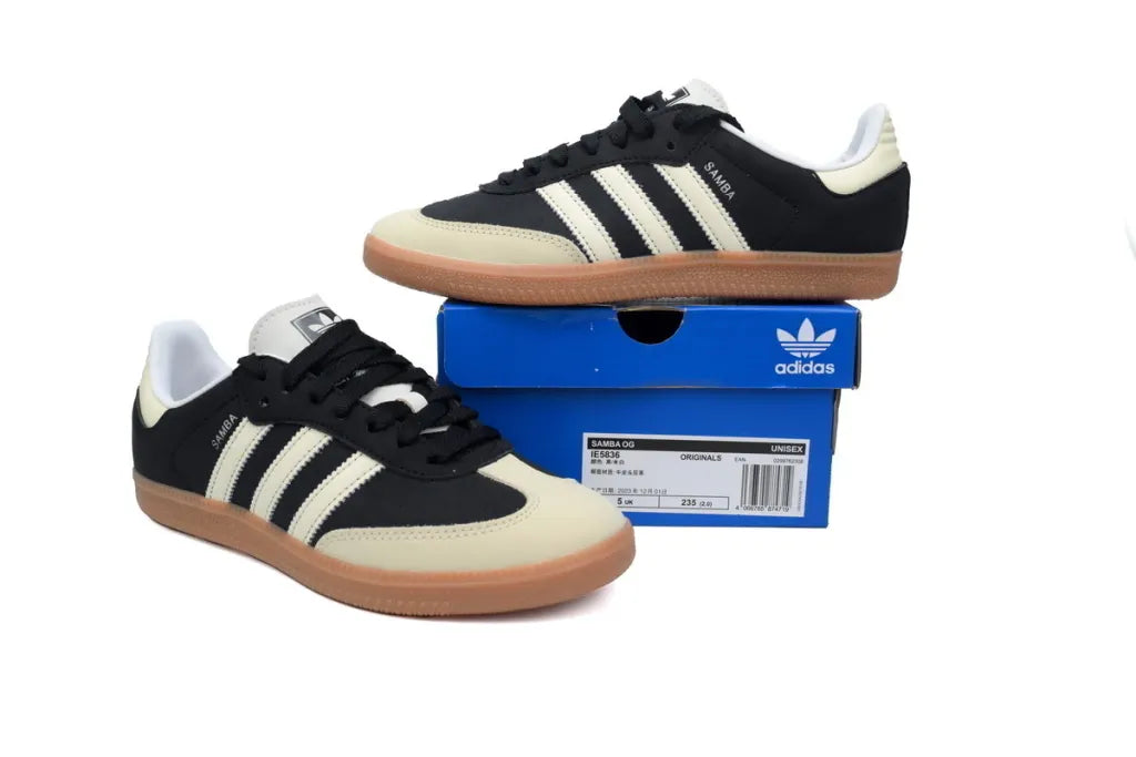 The Ad Samba OG - Black/White Gum is the ultimate classic, a silhouette that has defined sneaker culture for decades. Featuring a sleek black upper contrasted by crisp white serrated Three Stripes and heel tab, this timeless model is finished with a gum rubber sole that adds both grip and retro flair. The white “SAMBA” branding on the side keeps its heritage touch intact.