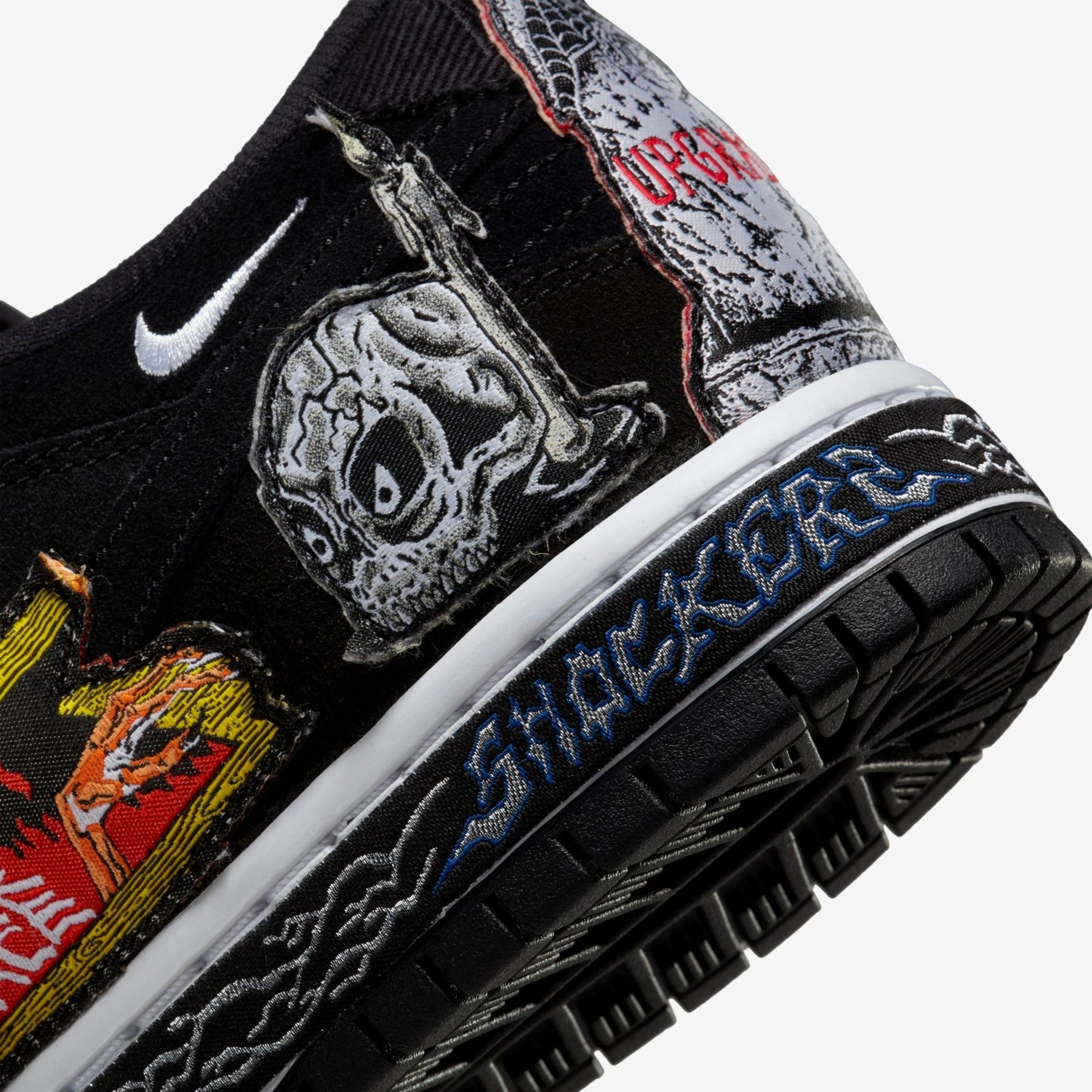 Known for his dark sense of humor, skater and artist Neckface brings his heavy-metal-inspired aesthetic to the SB Dunk Low. A staple in both skateboarding and graffiti culture for decades, Neckface channels the “good side of bad luck” with a collage of patches pulled straight from the Grim Reaper’s sketchbook. Skulls, demons, and eerie slogans cover the black upper, turning every session into a hellish ride.