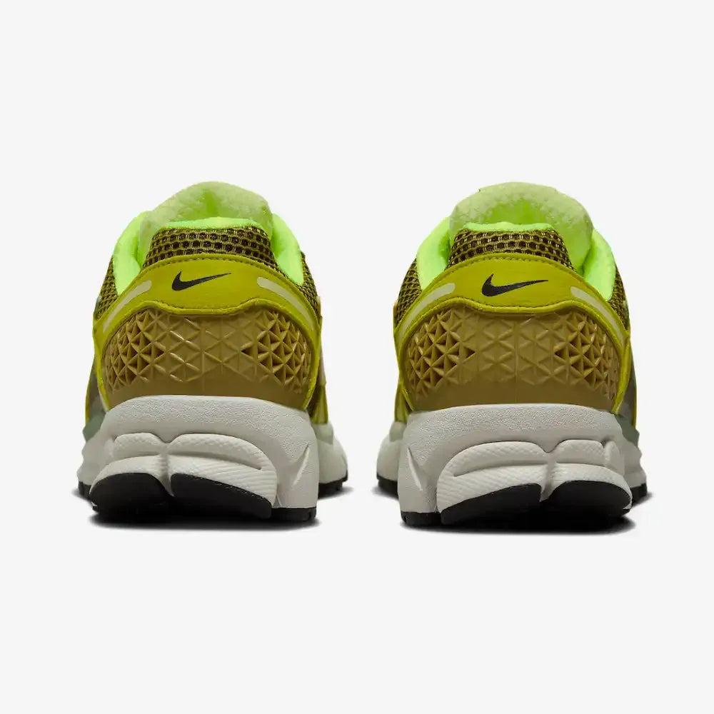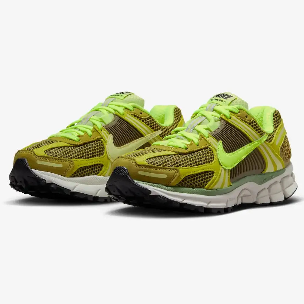 Dressed in Olive Flak, Volt, Moss, and Light Lemon Twist, this NK Zoom Vomero 5 features Bill Bowerman–inspired motifs printed on the insoles. The sneaker is built with an open mesh base and leather overlays, highlighted by signature plastic side panels and a molded heel counter. Zoom Air–branded insoles, 3M reflective hits, and responsive Zoom Air cushioning complete the design.