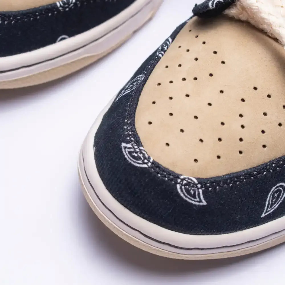 This special-edition release features a premium suede base overlaid with paisley canvas and plaid flannel panels, creating a layered look that evolves over time — as the paisley pattern wears away, an elephant print emerges beneath. The design is completed with embroidered Cactus Jack branding, rope-style laces, and padded tongues that nod to classic skate functionality.